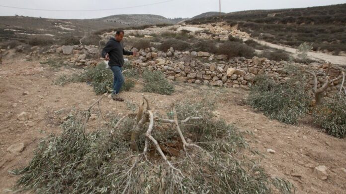 İsrailli grup, burada Filistinlilere ait yaklaşık 400 zeytin ağacını tahrip ederek kesti.