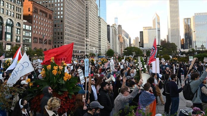 Göstericiler, federal hükümetin “kamu güvenliğini sağlama” gerekçesiyle aldığı kararla yerel yönetimlerin iradesini hiçe saydığını belirterek “ICE dışarı” ve “Filistin’den Chicago’ya, işgal suçtur” yazılı pankartlar taşıdı.