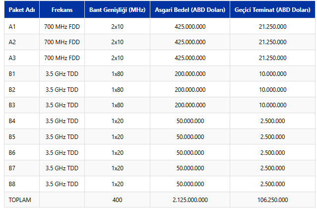 Bu tekliflerle, 2 frekans bandında 11 paket için verilen en yüksek tekliflerin toplam tutarı, KDV dahil 3 milyar 534 milyon dolar oldu.