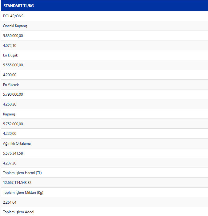 Borsa İstanbul Kıymetli Madenler Piyasası’nda standart altının kilogram fiyatı haftanın ilk işlem gününde yüzde 1,3 değer kaybederek 5 milyon 752 bin liraya indi. Altında en düşük 5 milyon 555 bin, en yüksek 5 milyon 790 bin lira görüldü.