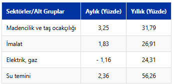 Sanayinin 4 sektörünün aylık değişimlerinde ise madencilik ve taş ocakçılığında yüzde 3,25, imalatta yüzde 1,83 ve su temininde yüzde 2,36 artış görülürken elektrik, gaz üretimi ve dağıtımında yüzde 1,16 azalış gerçekleşti.