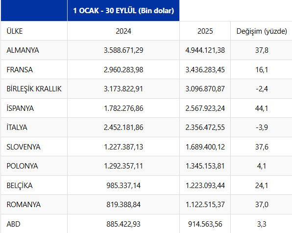 TİM verilerine göre, geçen yıl ve 2025’in ocak-eylül dönemi otomotiv endüstrisinin en fazla ihracat (bin dolar) gerçekleştirdiği ülkeler şöyle: