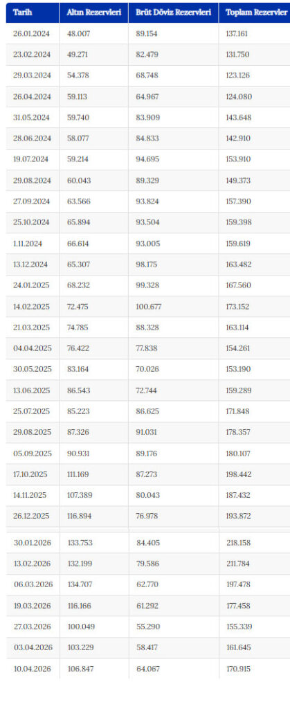 Türkiye Cumhuriyet Merkez Bankasının toplam rezervleri, 10 Nisan haftasında bir önceki haftaya göre 9 milyar 270 milyon dolar artarak 170 milyar 915 milyon dolara yükseldi.