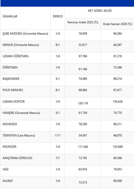 Bu artışlar neticesinde Ocak 2026 itibarıyla bazı kamu görevlilerinin net görev aylığı şöyle belirlendi: