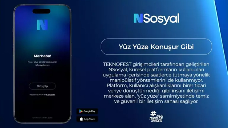 TEKNOFEST girişimcileri tarafından geliştirilen NSosyal, küresel platformların kullanıcıları uygulama içerisinde saatlerce tutmaya yönelik manipülatif yöntemlerini de kullanmıyor. Platform, kullanıcı alışkanlıklarını birer ticari veriye dönüştürmediği gibi insani iletişimi merkeze alan, ‘yüz yüze’ samimiyetinde temiz ve güvenli bir iletişim sahası sağlıyor.