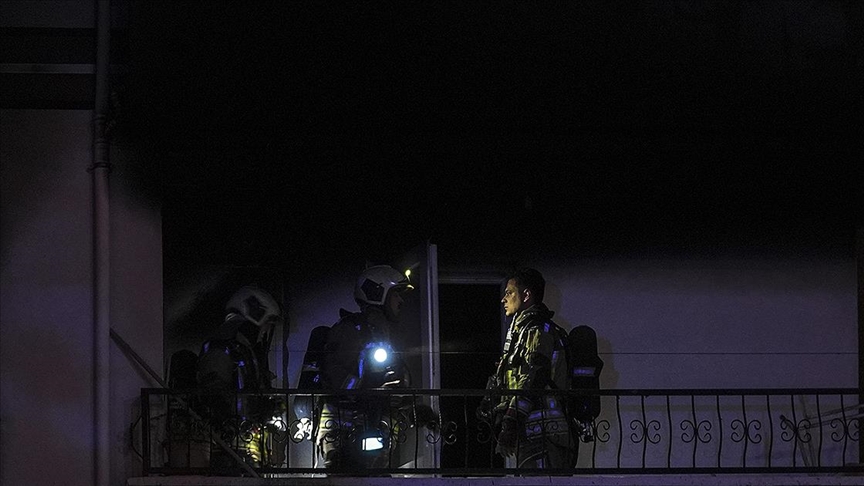 Yangın itfaiye ekiplerinin çalışmasıyla söndürülürken, hasar oluşan dairedeki patlamanın nedeni araştırılıyor. (AA)