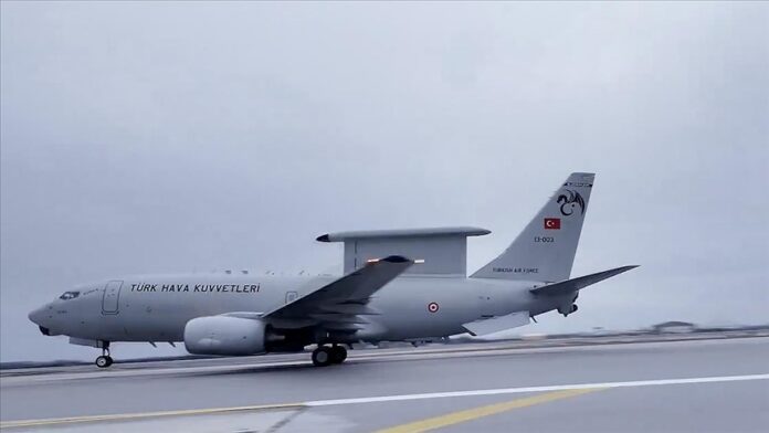 Görüntülerde, uçağın teknik kontrollerinin ardından havalanarak semadaki nöbetine başladığı anlar yer aldı. (AA)